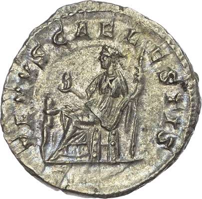 IVLIA SOAEMIAS AVG, draped bust of Julia Soaemias right. Rev. VENVS CAELESTIS, Venus seated left, holding sceptre and apple, infant to left. (RIC 243; BMC 537). Extremely Fine. Pleasing iridescence.