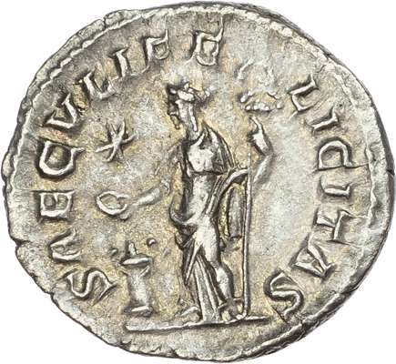 IVLIA MAESA AVG, draped bust of Julia Maesa right. Rev. SAECVLI FELICITAS, Felicitas standing left, holding patera and cornucopiae, altar and star to left. (RIC 272; BMC 81; RSC 45). Extremely Fine. Portrait of high relief.
