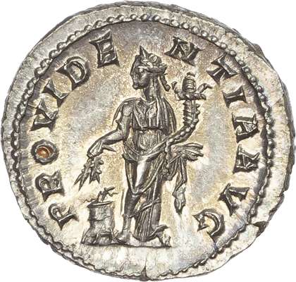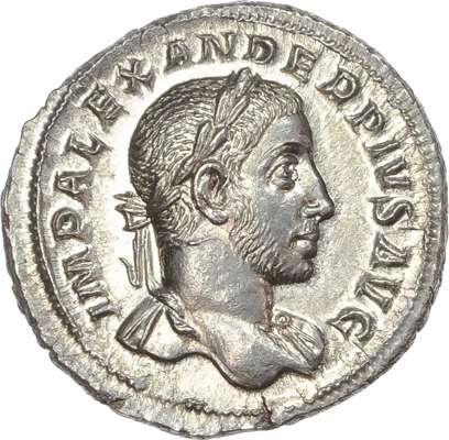 IMP ALEXANDER AVG, laureate head of Severus Alexander right. Rev. PROVIDE-NTIA AVG, Providentia standing left, holding grain ears and cornucopiae. (RIC 250). Good Extremely Fine. Well-centred and lustrous.