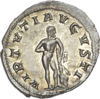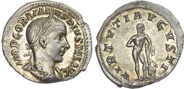 IMP GORDIANVS PIVS FEL AVG, laureate, draped and cuirassed bust of Gordian III right. Rev. VIRTVTI AVGVSTI, statue of Hercules right, with the Apples of the Hesperides and lionskin, leaning on club. (RIC 116). Good Extremely Fine.