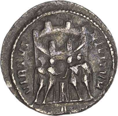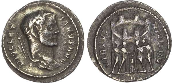 DIOCLETIANVS AVG, laureate head right. Rev. VIRTVS MILITVM, the four Tetrarchs sacrifi cing before the gate of a Roman camp. (RIC 40a; RSC 516g). Fine.