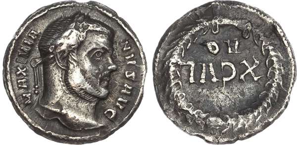 MAXIMIA-NVS AVG, laureate head right. Rev. XCVI / AQ, within a laurel wreath. (RIC 16b; RSC 697). Very Fine.