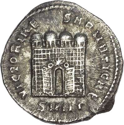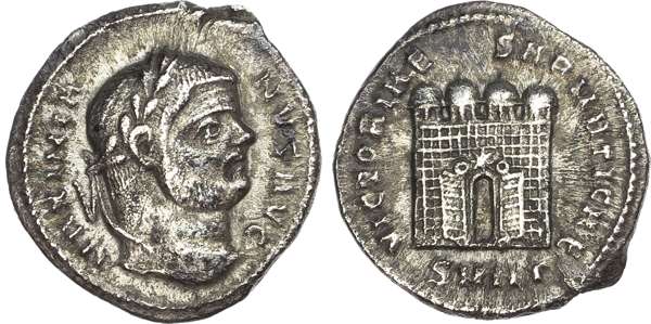 MAXIMIA-NVS AVG, laureate head right. Rev. VICTORIAE SARMATICAE, camp gate with four turrets, SMNΓ in exergue. (RIC 25b; RSC 553c). Very Fine.