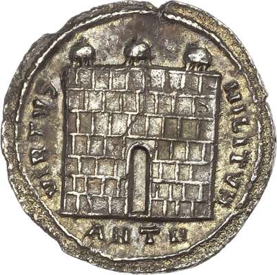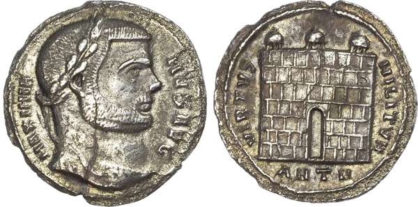MAXIMIA-NVS AVG, laureate head right. Rev. VIRTVS MILITVM, camp gate with three turrets, ANT•H in exergue. (RIC 39b; RSC 627j). Very Fine. Flan crack.