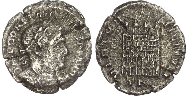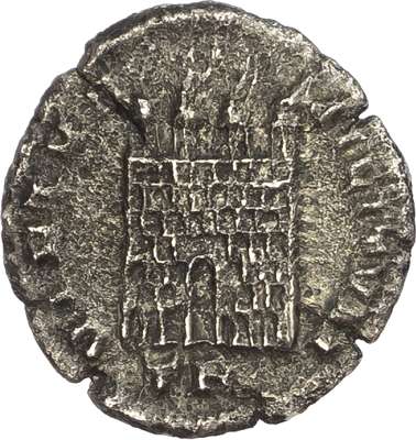 IMP CONSTANTINVS AVG, helmeted and cuirassed bust right. Rev. VIRTVS MILITVM, camp gate with four turrets, TR in exergue. (RIC 758; RSC 707e). Fine. Flan cracks. Rare.