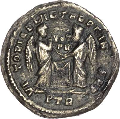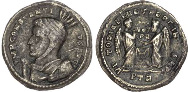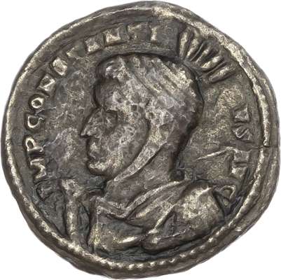 IMP CONSTANTI-NVS AVG, helmeted and cuirassed bust left, holding spear over shoulder. Rev. VICTORIAE LAETAE PRINC PERP, two Victories facing one another, holding shield inscribed ‘VOT / P R’, PTR in exergue. (RIC 208A; RSC 643). Very Fine. Good metal.