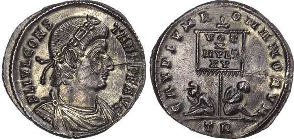 FL IVL CONS-TANS P F AVG, diademed, draped and cuirassed bust right. Rev. GAVDIVM ROMANORVM, two captives seated beneath standard inscribed ‘VOT / X / MVLT / XV’, TR in exergue. (RIC 152; RSC 44). About Extremely Fine. Flan crack and slight bend. Extremely Rare.