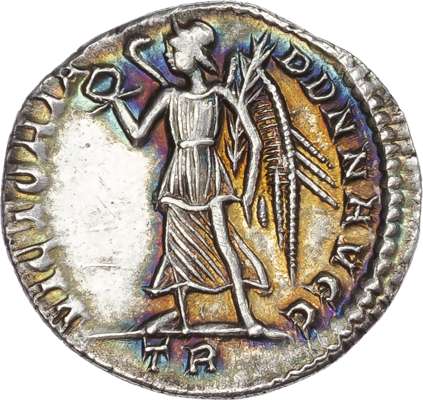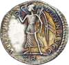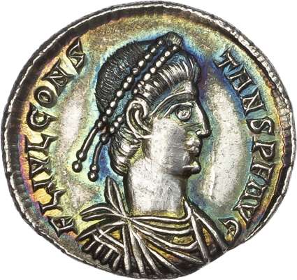 FL IVL CONS-TANS P F AVG, diademed and draped bust right. Rev. VICTORIA DD NN AVGG, Victory standing left, holding wreath and palm, TR in exergue. (RIC 176; RSC 152a). Good Extremely Fine. Pleasing toned lustre and blue iridescence. A superb piece.