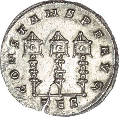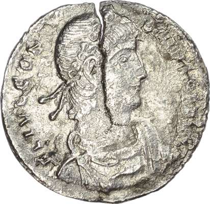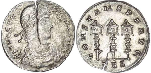 Diademed, draped and cuirassed bust right. Rev. CONSTANS P F AVG, three military standards. Obverse Fair, reverse Nearly Extremely Fine. Large flan crack. Extremely Rare.