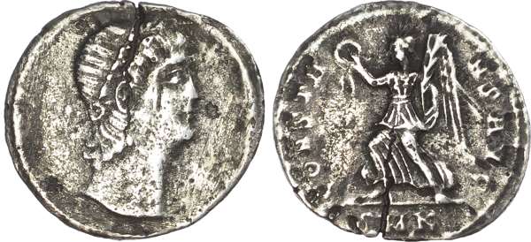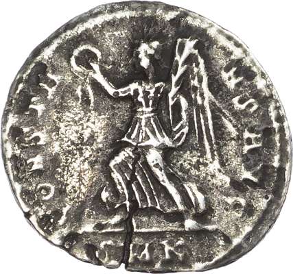 Diademed head of Constans right, looking upwards. Rev. CONSTA-NS AVG, Victory advancing left, holding wreath and palm, SMK in exergue. Fair. Very Rare.