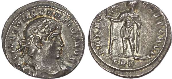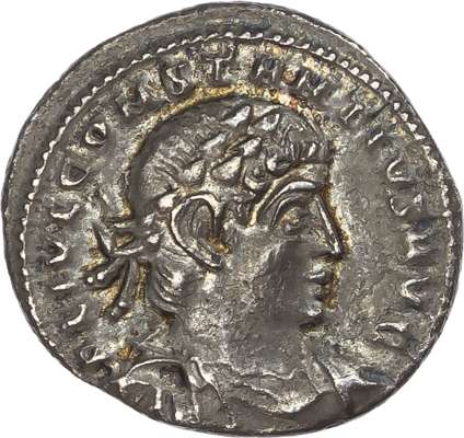 FL IVL CONSTANTIVS AVG, laureate, draped and cuirassed bust right. Rev. PAX AV-GVSTORVM, Emperor standing left, holding labarum, TRS in exergue. (RIC 31; C. 150). Nearly Extremely Fine. Pleasing cabinet tone. Rare.