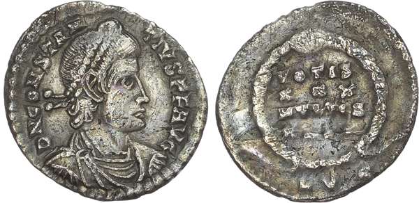 DN CONSTAN-TIVS AVG, diademed, draped and cuirassed bust right. Rev. VOTIS / XXX / MVLTIS XXXX, within a laurel wreath, LVG in exergue. (RIC 216; RSC 342-3a). Fine.