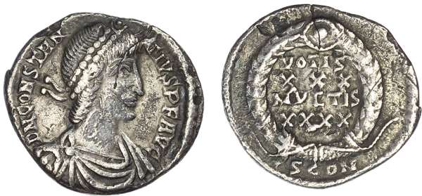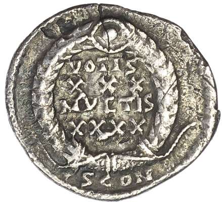 DN CONSTAN-TIVS AVG, diademed, draped and cuirassed bust right. Rev. VOTIS / XXX / MVLTIS XXXX, within a laurel wreath, SCON in exergue. (RIC 291; RSC 342-3r). Fine.