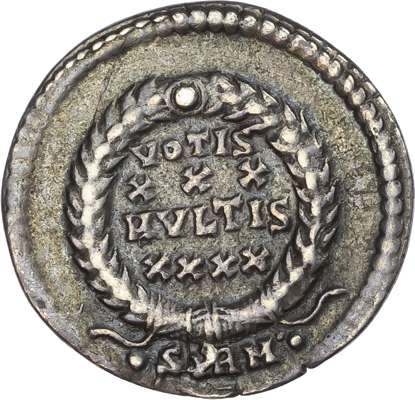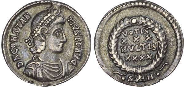 DN CONSTAN-TIVS AVG, diademed, draped and cuirassed bust right. Rev. VOTIS / XXX / MVLTIS / XXXX, within a laurel wreath, •SIRM• in exergue. (RIC 66; RSC 342-3i). Good Very Fine.