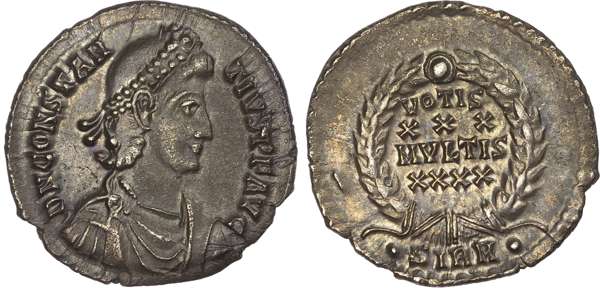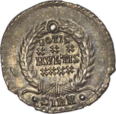 DN CONSTAN-TIVS AVG, diademed, draped and cuirassed bust right. Rev. VOTIS / XXX / MVLTIS / XXXX, within a laurel wreath, •SIRM• in exergue. (RIC 66; RSC 342-3i). Extremely Fine. Dark cabinet tone. A very pleasing example.