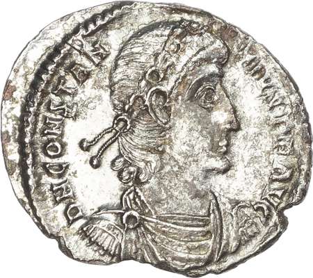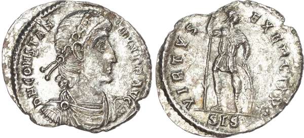 DN CONSTAN-TIVS P F AVG, diademed, draped and cuirassed bust right. Rev. VIRTVS EXERCITVS, Virtus standing left, head right, holding spear and shield, SIS in exergue. (RIC 323). Edge chipped and rough surfaces, otherwise Good Very Fine. Rare.