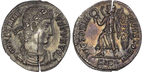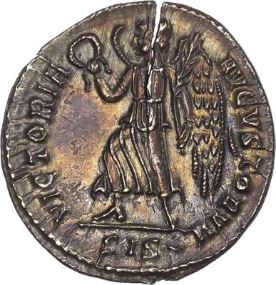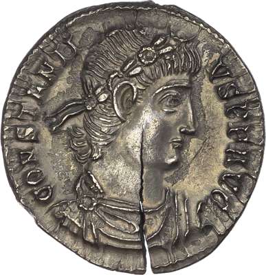 DN CONSTANTI-VS AVG, diademed, draped and cuirassed bust right. Rev. VICTORIA AVGVSTOVM, Victory advancing left, holding wreath and palm, SIS(pellet-in-crescent) in exergue. (RIC 165; RSC 234Ac). Extremely Fine. Cabinet tone. Flan crack.