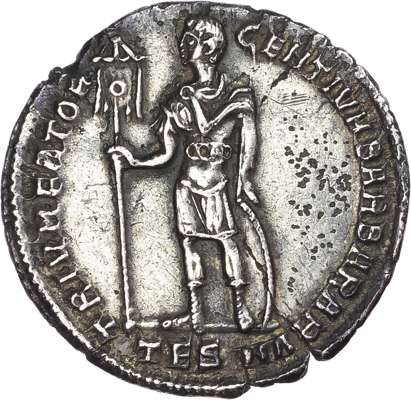 DN CONSTAN-TIVS P F AVG, diademed, draped and cuirassed bust right. Rev. TRIVMFATOR – GENTIVM BARBARVM, Emperor standing right, holding standard and shield, TES in exergue. (RIC 84; C. 192). Good Very Fine. Attractive tone. Rare.