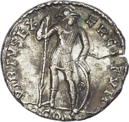 DN CONSTAN-TIVS P F AVG, diademed, draped and cuirassed bust right. Rev. VIRTVS EXERCITVS, Virtus standing left, head right, holding spear and shield, PCON in exergue. (RIC 289; RSC 324a). Very Fine. Somewhat rough.