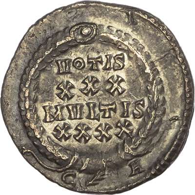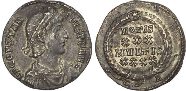 DN CONSTA-NTIVS AVG, diademed, draped and cuirassed bust right. Rev. VOTIS / XXX / MVLTIS, within a laurel wreath, C (branch) A in exergue. (RIC 104). Very Fine.