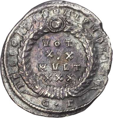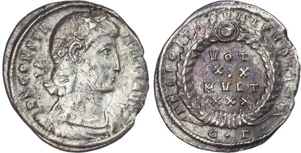 DN CONSTA-NTIVS AVG, diademed, draped and cuirassed bust right. Rev. FELICITAS REI PVBLICAE, VOT / X.X / MVLT / XXX, within a laurel wreath, C•r in exergue. (RIC 59; RSC 70b). Rare. Good Fine.