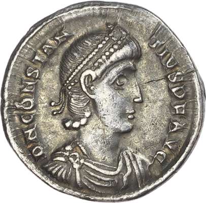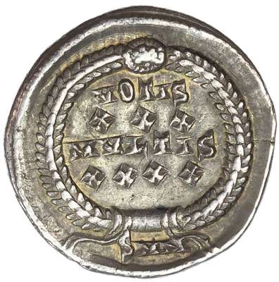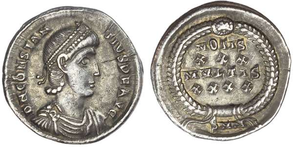 DN CONSTAN-TIVS AVG, diademed, draped and cuirassed bust right. Rev. VOTIS / XXX / MVLTIS / XXXX, within a laurel wreath, SMN in exergue. (RIC 81; RSC 342-3I). Good Very Fine. Rare.