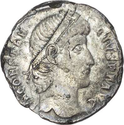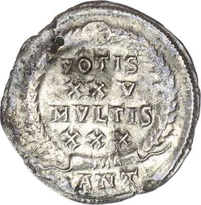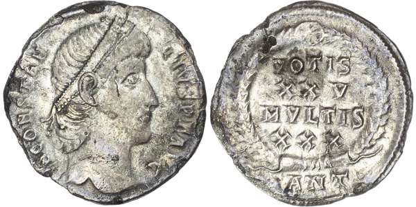 DN CONSTA-NTIVS AVG, diademed, draped and cuirassed bust right. Rev. VOTIS / XXV / MVLTIS / XXX, within a laurel wreath, ANT in exergue. (RIC 106; RSC 340d). Fine. A little rough.