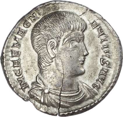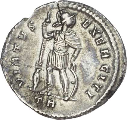 DN CAE MAGN-ENTIVS AVG, bareheaded, draped and cuirassed bust right. Rev. VIRTVS EXERCITI, Virtus standing facing, head right, holding spear and shield, TR in exergue. (RIC 256; RSC 82). Attractive cabinet tone. Flan crack. Good Very Fine. Rare.