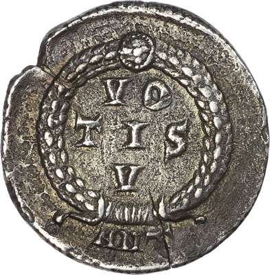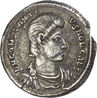 DN CONSTANTI-VS NOB CAES, bareheaded, draped and cuirassed bust right. Rev. VO/TIS/V within a laurel wreath, ANT in exergue. (RIC 109; RSC 53A). Very Fine. A couple of marks.