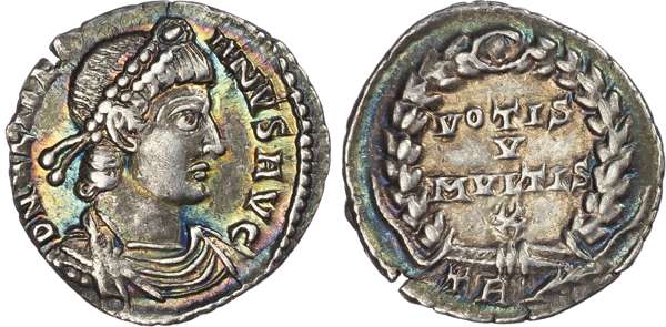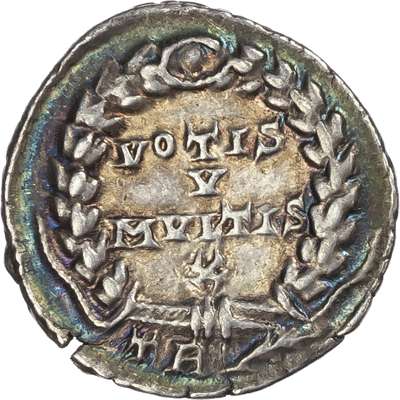 DN CL IVLI-ANVS AVG, diademed, draped and cuirassed bust right. Rev. VOTIS/V/MVLTIS/X within a laurel wreath, TR and branch in exergue. (RIC 365; RSC 157b). About Extremely Fine. Beautiful cabinet tone.