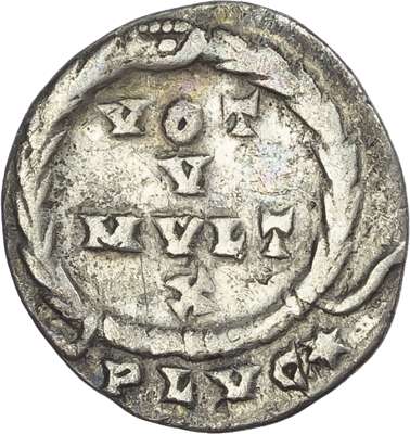 DN CL IVLI-ANVS AVG, diademed, draped and cuirassed bust right. Rev. VOT/X/MVLT/XX within a laurel wreath, PLVG* in exergue. (RIC 227 var (star); RSC 163b). Fine. Rare.