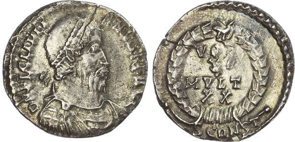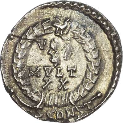 DN CL IVLI-ANVS AVG, bearded, diademed, draped and cuirassed bust right. Rev. VOT/X/MVLT/XX within a laurel wreath with medallion depicting eagle at apex, SCONST in exergue. (RIC 312; RSC 148c). Good Very Fine. Flan crack.