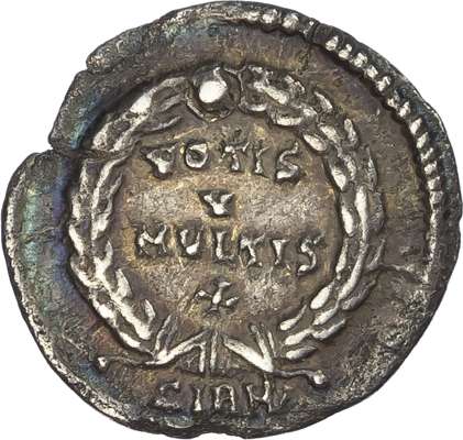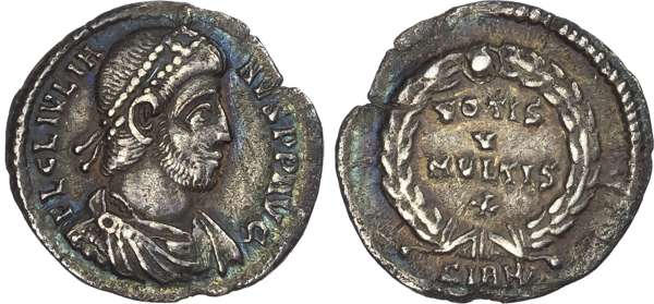 DN CL IVLIA-NVS AVG, bearded, diademed, draped and cuirassed bust right. Rev. VOT/X/MVLT/XX within a laurel wreath, SCONS in exergue. (RIC 312; RSC 148c). About Very Fine.