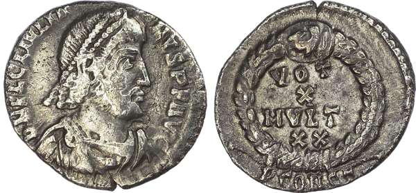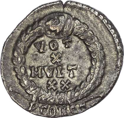 DN CL IVLIA-NVS AVG, bearded, diademed, draped and cuirassed bust right. Rev. VOT/X/MVLT/XX within a laurel wreath, SCONST in exergue. (RIC 312; RSC 148c). Very Fine. Flan crack.