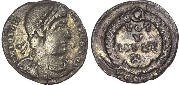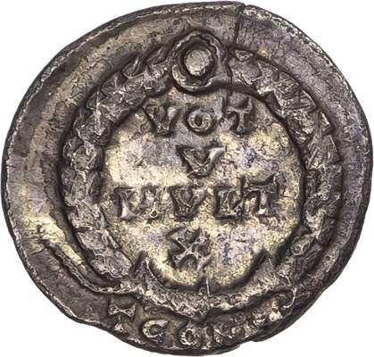 DN IOVIAN-VS P F AVG, diademed, draped and cuirassed bust right. Rev. VOT/V/MVLT/X within a laurel wreath, TCONST in exergue. (RIC 331). Very Fine. Scarce.