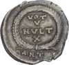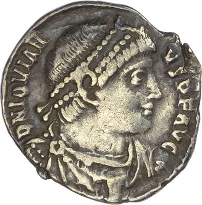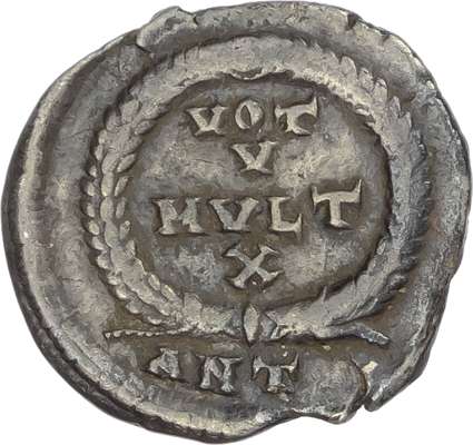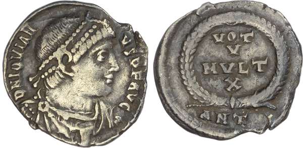 DN IOVIAN-VS P F AVG, diademed, draped and cuirassed bust right. Rev. VOT/V/MVLT/X within a laurel wreath, ANT in exergue. (RIC 227; C. 33). Good Very Fine. Ragged flan.