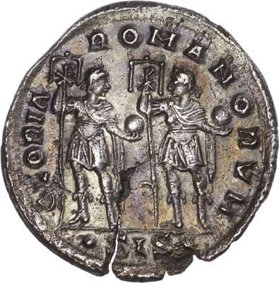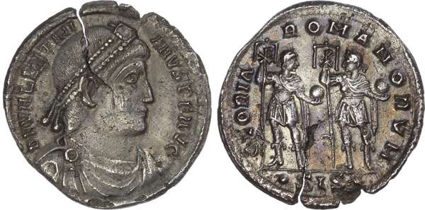 DN VALENTINI-ANVS P F AVG, diademed, draped and cuirassed bust right. Rev. GLORIA ROMANORVM, two emperors standing facing, heads turned towards each other, each holding labarum and globe, SIS in exergue. (RIC 3a). Good Very Fine. Pleasing cabinet tone. Flan crack. Extremely Rare.