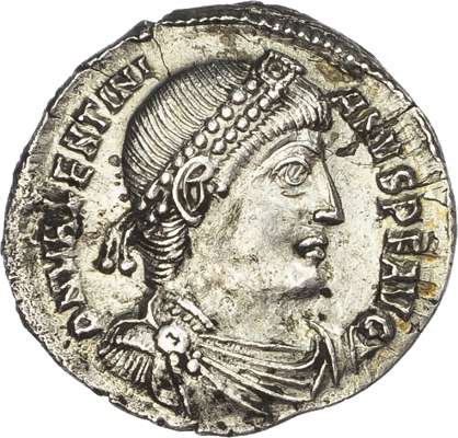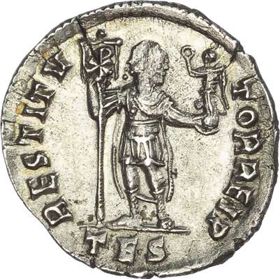 DN VALENTINI-ANVS P F AVG, diademed, draped and cuirassed bust right. Rev. RESTITV-TOR REIP, Emperor standing left, head right, holding labarum topped with Christogram and Victory on globe, TES in exergue. (RIC 12a; RSC 18-19k). About Extremely Fine.