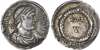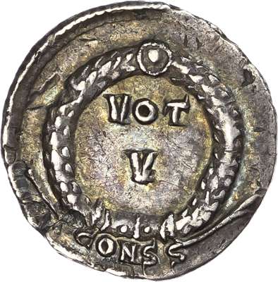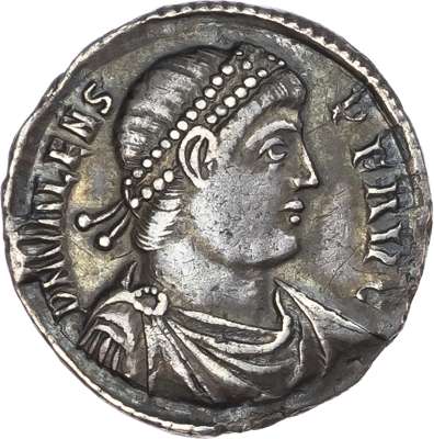 DN VALEN-S P F AVG, diademed, draped and cuirassed bust right. Rev. VOT V, within a laurel wreath, CONSS in exergue. (RIC 11d). Very Fine. Beautiful cabinet tone.
