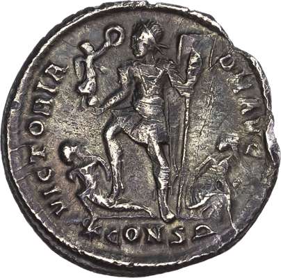 DN VALENS P F AVG, diademed, draped and cuirassed bust right. Rev. VICTORIA DN AVG, Emperor standing left, holding Victory on globe and standard, foot on crouching captive, seated captive behind, *CONSo in exergue. (RIC 32). Very Fine. Scratches to portrait. Extremely Rare. Pleasing cabinet tone.