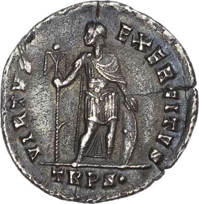 DN GRATIA-NVS P F AVG, diademed, draped and cuirassed bust right. Rev. VIRTVS EXERCITVS, Virtus standing right, head left, holding spear and shield, TRPS• in exergue. (RIC 26e; RSC 52b). Very Fine. Some flan cracks.