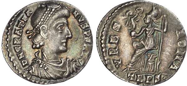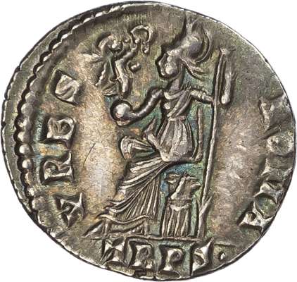 DN GRATIA-NVS P F AVG, diademed, draped and cuirassed bust right. Rev. VRBS ROMA, Roma seated left on cuirass, holding Victory and sceptre, star in right fi eld, TRPS• in exergue. (RIC 27f; RSC 86a). Good Very Fine or better. Pleasing cabinet tone.