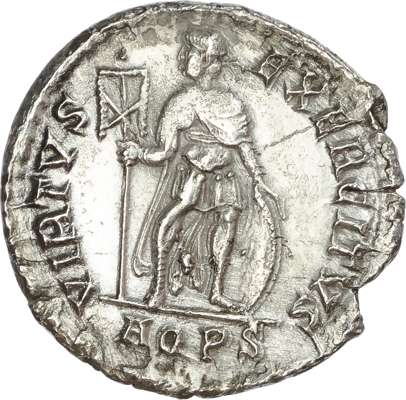 DN GRATIA-NVS P F AVG, diademed, draped and cuirassed bust right. Rev. VIRTVS EXERCITVS, Virtus standing right, head left, holding spear and shield, AQPS in exergue. (RIC 23a; RSC 52d). Good Very Fine. Some roughness. Extremely Rare.