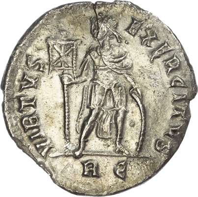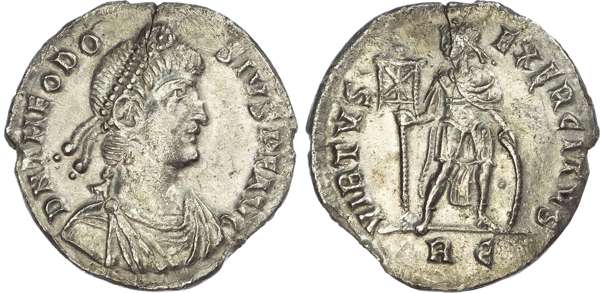 DN THEODO-SIVS P F AVG, diademed, draped and cuirassed bust right. Rev. VIRTVS EXERCITVS, Virtus standing right, head left, holding spear and shield, RЄ in exergue. (RIC 34c; C. 55). Good Very Fine. Some marks. Very Rare.