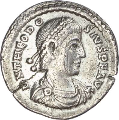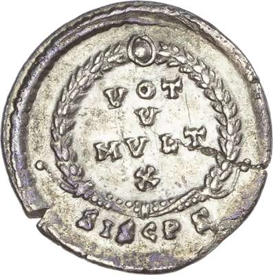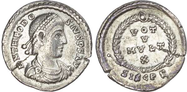 DN THEODO-SIVS P F AVG, diademed, draped and cuirassed bust right. Rev. VOT / V / MVLT / X, within a laurel wreath, SISCPS in exergue. (RIC 24b).