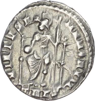 DN MAG MAX-IMVS P F AVG, diademed, draped and cuirassed bust of Magnus Maximus facing right. Rev. VIRTVS RO-MANORVM, Roma seated on throne, holding globe and sceptre. (RIC 84b; RSC 20a). Good Very Fine.