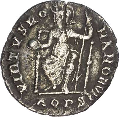 DN FL VIC-TOR P F AVG, diademed, draped and cuirassed bust of Flavius Victor facing right. Rev. VIRTVS RO-MANORVM, Roma seated facing, head left, holding globe and sceptre, AQPS in exergue. (RIC 53b; RSC 4). Very Fine. Rare.