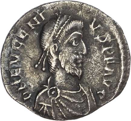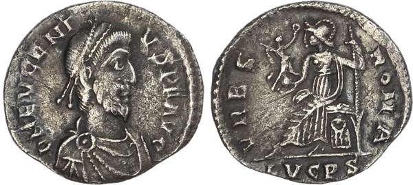 DN EVGENI-VS P F AVG, diademed, draped and cuirassed bust of Flavius Victor facing right. Rev. VRBS ROMA, Roma seated left on cuirass, holding Victory on globe and sceptre, LVGPS in exergue. (RIC 46; RSC 18A). Good Very Fine. Scarce.