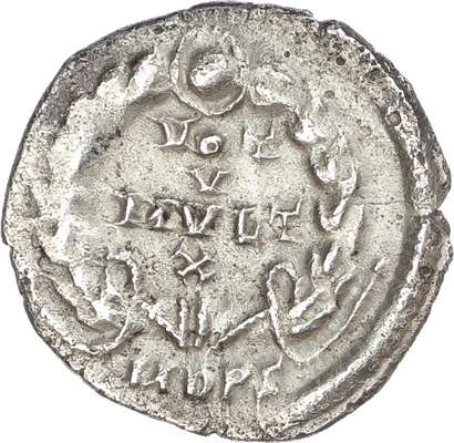 DN HONORI-VS P F AVG, diademed, draped and cuirassed bust right. Rev. VOT / V / MVLT / X, within a laurel wreath, MDPS in exergue. (RIC 1226; RSC 63). Good Very Fine. Very Rare.