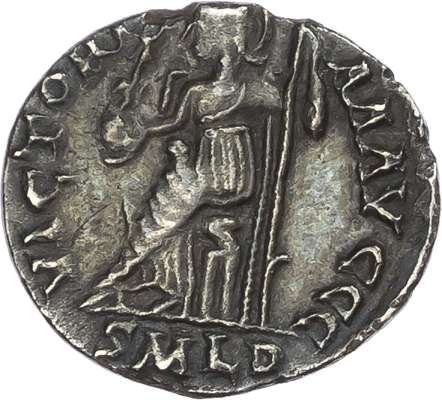 DN CONSTANTINVS P F AVG, diademed, draped and cuirassed bust right. Rev. VICTORI-A AAVGGG, Roma seated left on throne, holding Victory on globe and sceptre, SMLD in exergue. (RIC 1531; 4b). Very Fine. A few light scratches. Scarce.